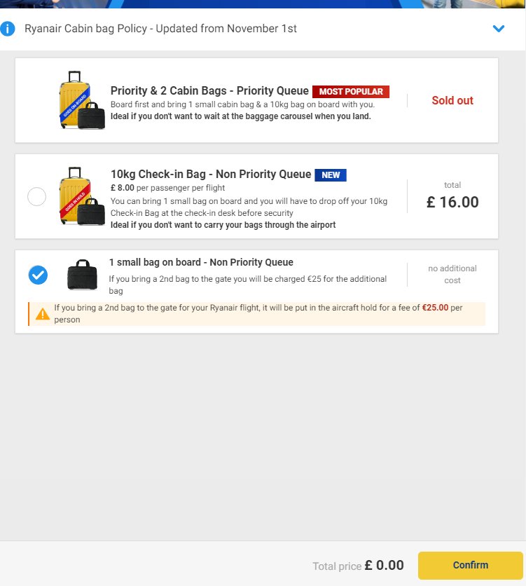 Ryanair passengers brace for new bag ryanair priority sold out