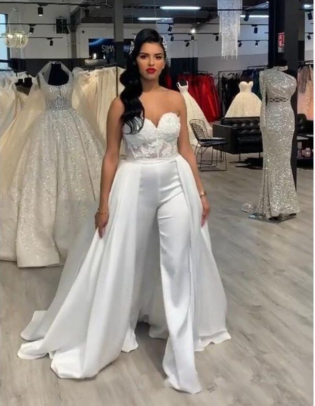 Strapless White Bride Wedding Gowns white bridal pantsuit with train