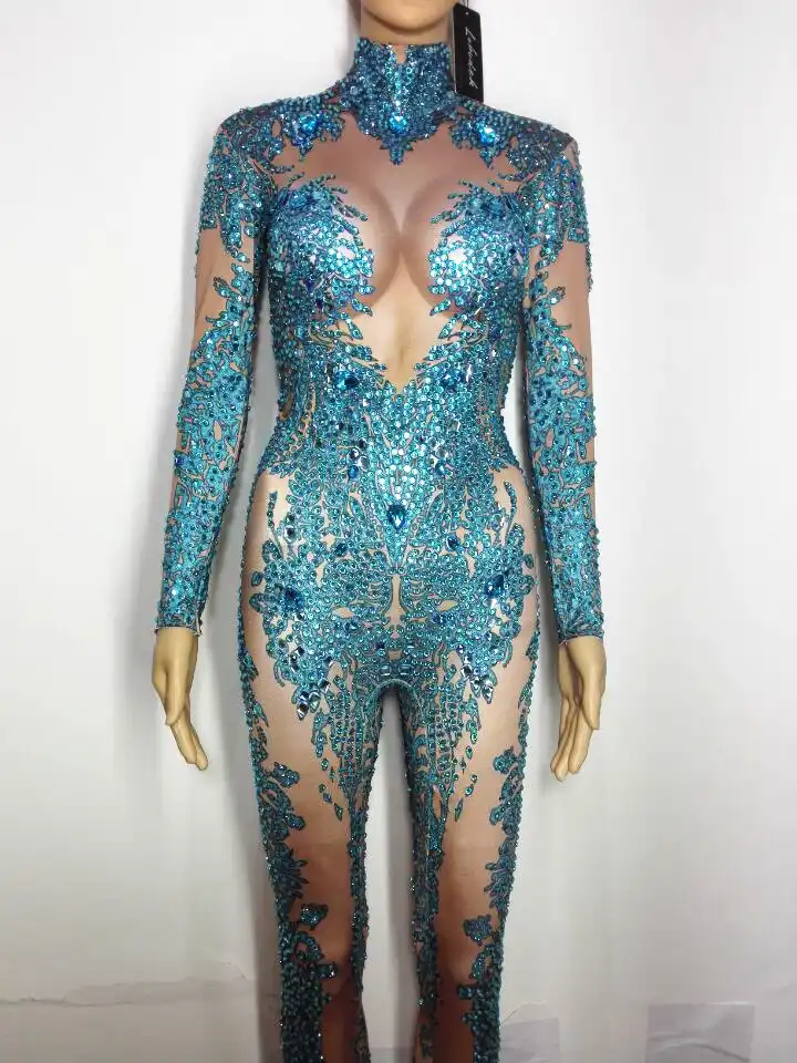 Shining Blue Rhinestones Jumpsuit blue rhinestone jumpsuit