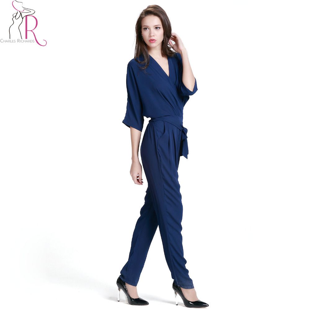 2020 Navy Blue V Neck Wrap Tie Waist navy blue jumpsuit with sleeves